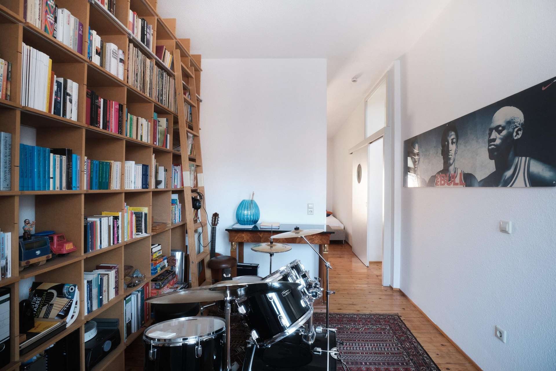 Auf beiden Seiten befinden sich außerdem große Terrassen, die in den Sommermonaten dazu einladen, viel Zeit an der frischen Luft zu verbringen. Die Terrasse auf der Frontseite des Hinterhauses ist eher lang und schmal geschnitten und erstreckt sich über die gesamte Breite des Hauses. Die Terrasse auf der Rückseite ist hingegen breit genug, um im Familienkreis ein kleines Grillfest über den Dächern des Stadtteils zu entrichten. Die gesamte Maisonette-Wohnung begeistert durch ihre intelligente Raumaufteilung und das charmante Wechselspiel von rustikal und neu. Die Böden auf der unteren Etage bestehen aus massiven Vollholz-Dielen, während im oberen Bereich ein hochwertiger Bodenbelag aus blauem Linolium verlegt wurde. Ein kompaktes Gäste-WC auf der unteren Etage, zwei Abstellkammern auf der nördlichen Außenterrasse und ein sehr geräumiges Kellerabteil runden das Wohnerlebnis auf nützliche Weise ab.