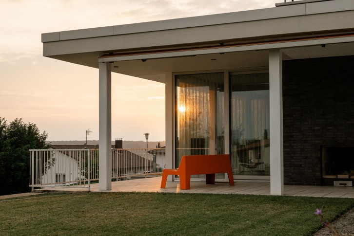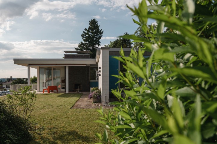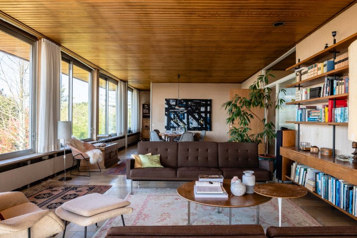 "The Bauhaus vibe is strong inside this Weinheim villa by Jan and Waldemar Lippert. Built in a boxy post-war modern style, the hillside German property retains original 1963 finishes across its interior spaces. The living room and dining area feature a continuous wall of windows, overlooking the Rhine, while the 1960s kitchen has been very gently updated."